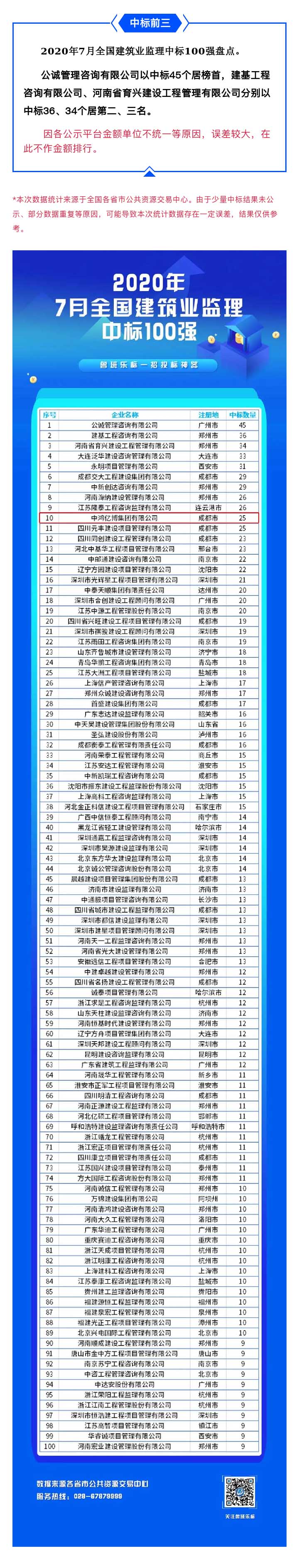 集團挺進2020年7月建筑業(yè)監(jiān)理中標數(shù)量全國前十強
