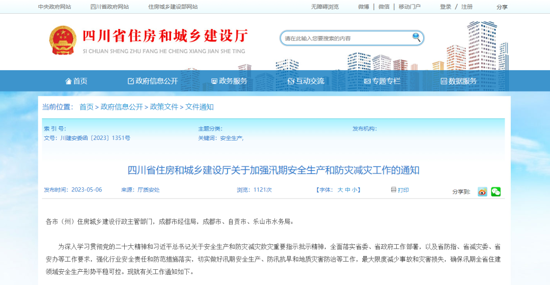 2023年5月6日,四川省住房和城鄉(xiāng)建設(shè)廳發(fā)布《關(guān)于加強(qiáng)汛期安全生產(chǎn)和防災(zāi)減災(zāi)工作的通知》。