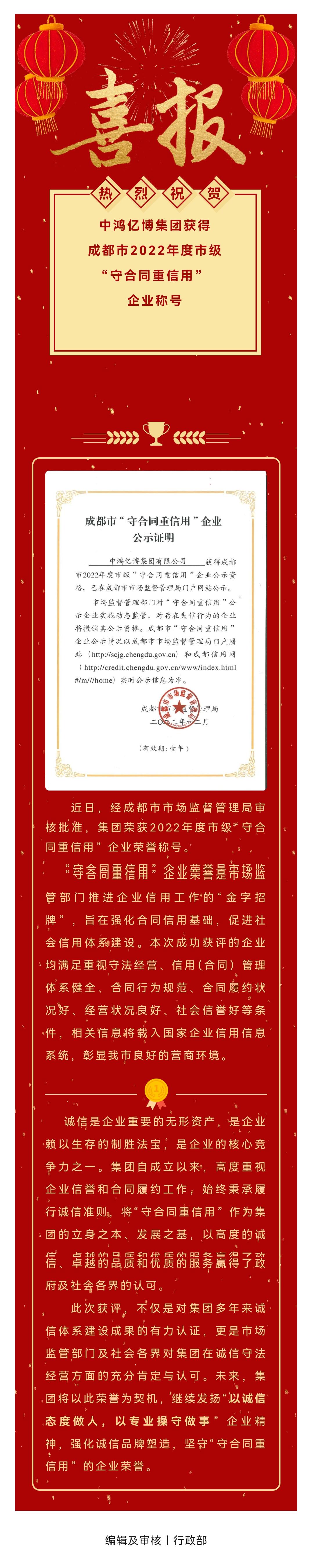 億博動(dòng)態(tài)丨恭喜集團(tuán)榮獲成都市2022年度市級(jí)“守合同重信用“企業(yè)稱號(hào)