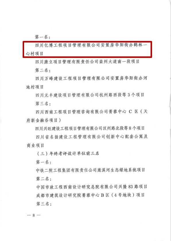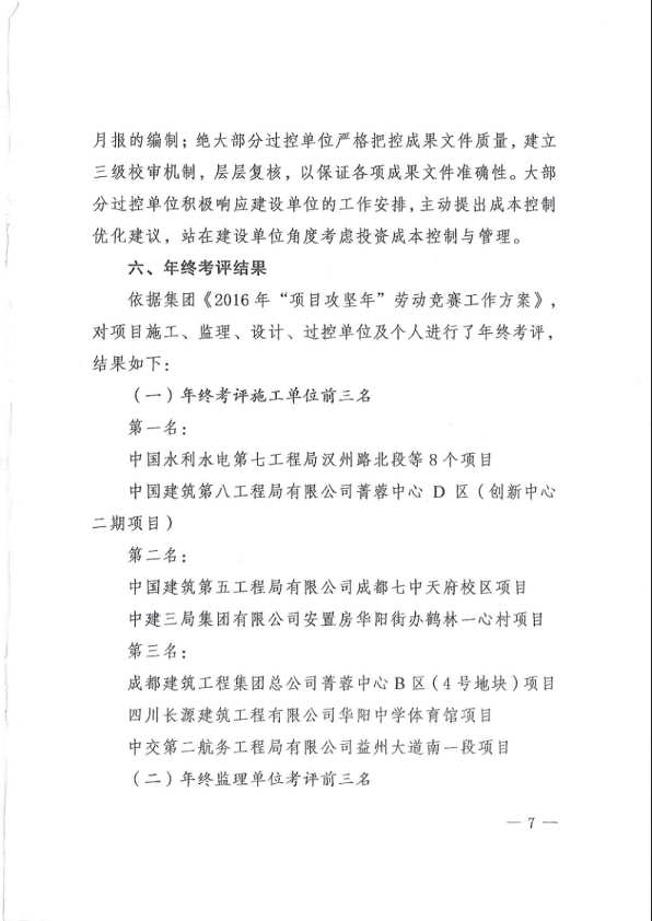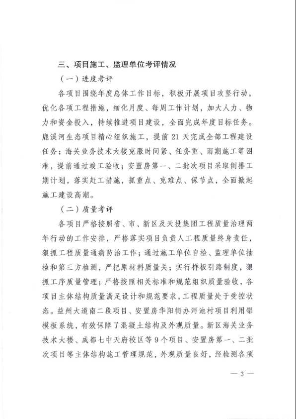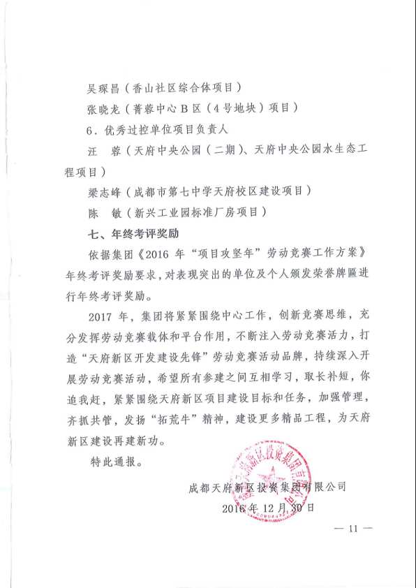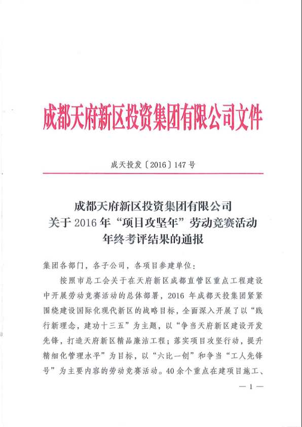 成都天投集團于2017年1月11日下午2:30在天府菁蓉中心A區(qū)4號樓二樓會議室順利召開了2016年度“項目攻堅年”勞動競賽活動年終考評表彰大會,參會單位包括成都市及天府新區(qū)總工會、天府新區(qū)質(zhì)安站、天投集團及相關(guān)部門、各項目設(shè)計單位、施工單位、監(jiān)理單位及過控單位等相關(guān)領(lǐng)導及各項目負責人。在此次成都天投集團“項目攻堅年”勞動競賽活動年終考評表彰中,對年度表現(xiàn)突出的單位及個人頒發(fā)榮譽證書和榮譽牌匾獎勵,我公司取得第一名的傲人成績。會議要求2017年將持續(xù)在天府新區(qū)建設(shè)深入開展勞動競賽活動,希望獲獎單位及個人戒驕戒躁,繼續(xù)努力。希望所有參建單位之間互相學習,取長補短,你追我趕,緊緊圍繞天府新區(qū)項目建設(shè)目標和任務(wù),加強管理,齊抓共管,發(fā)揚“拓荒牛”精神,建設(shè)更多精品工程,為天府新區(qū)建設(shè)再建新功。