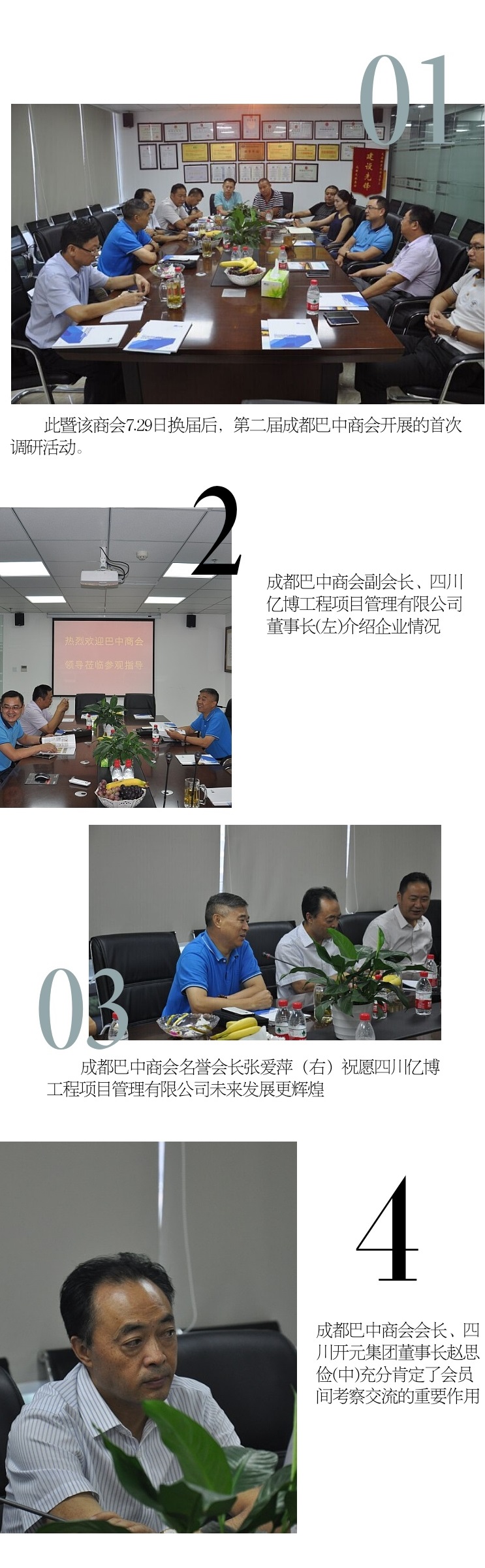 趙思儉會(huì)長(zhǎng)強(qiáng)調(diào)指出:“這是商會(huì)換屆以來(lái)的第一次活動(dòng),來(lái)到四川億博工程項(xiàng)目管理有限公司開(kāi)展考察調(diào)研,意義非常重大。一是商會(huì)這么多領(lǐng)導(dǎo)百忙之中積極參加商會(huì)活動(dòng),說(shuō)明大家高度重視商會(huì),關(guān)心商會(huì)的發(fā)展,都希望商會(huì)越來(lái)越強(qiáng)大;二是商會(huì)內(nèi)部企業(yè)相互交流學(xué)習(xí),通過(guò)考察調(diào)研,互相借鑒優(yōu)秀的企業(yè)經(jīng)營(yíng)理念和運(yùn)營(yíng)經(jīng)驗(yàn),這是十分寶貴的。今后,商會(huì)將經(jīng)常性組織會(huì)員之間的企業(yè)考察,帶領(lǐng)會(huì)員向國(guó)內(nèi)先進(jìn)企業(yè)學(xué)習(xí)、向國(guó)外優(yōu)秀企業(yè)取經(jīng);三是商會(huì)將引導(dǎo)全體會(huì)員整合抱團(tuán),通過(guò)商會(huì)項(xiàng)目運(yùn)營(yíng)使廣大會(huì)員在商會(huì)平臺(tái)切實(shí)得到實(shí)惠;四是帶領(lǐng)全體會(huì)員立足四川,走向全國(guó),走向國(guó)際。商會(huì)將成為巴商企業(yè)品牌和巴商企業(yè)家的孵化器,通過(guò)一系列的商會(huì)活動(dòng)和實(shí)踐活動(dòng),全面提升巴商隊(duì)伍整體內(nèi)功,重點(diǎn)培育巴商品牌,培育一大批真正的巴商企業(yè)家。”