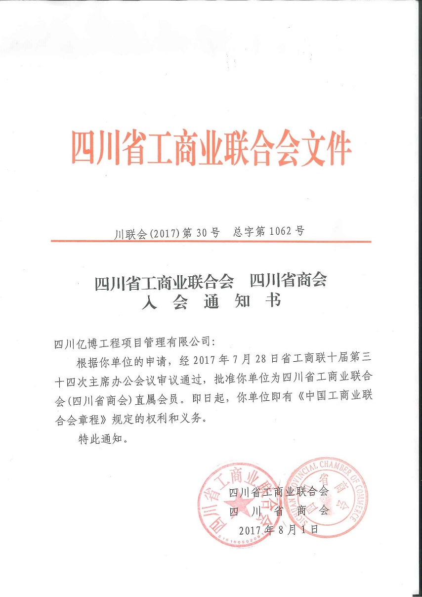 四川省工商業(yè)聯(lián)合會(huì) 四川省商會(huì)入會(huì)通知書