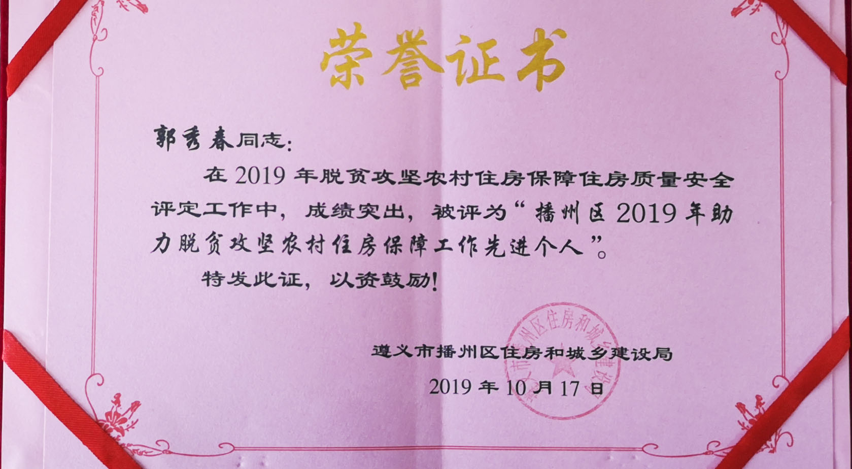 郭秀春同志被評為“播州區(qū)2019年助理脫貧攻堅農(nóng)村住房保障工作先進個人”。
