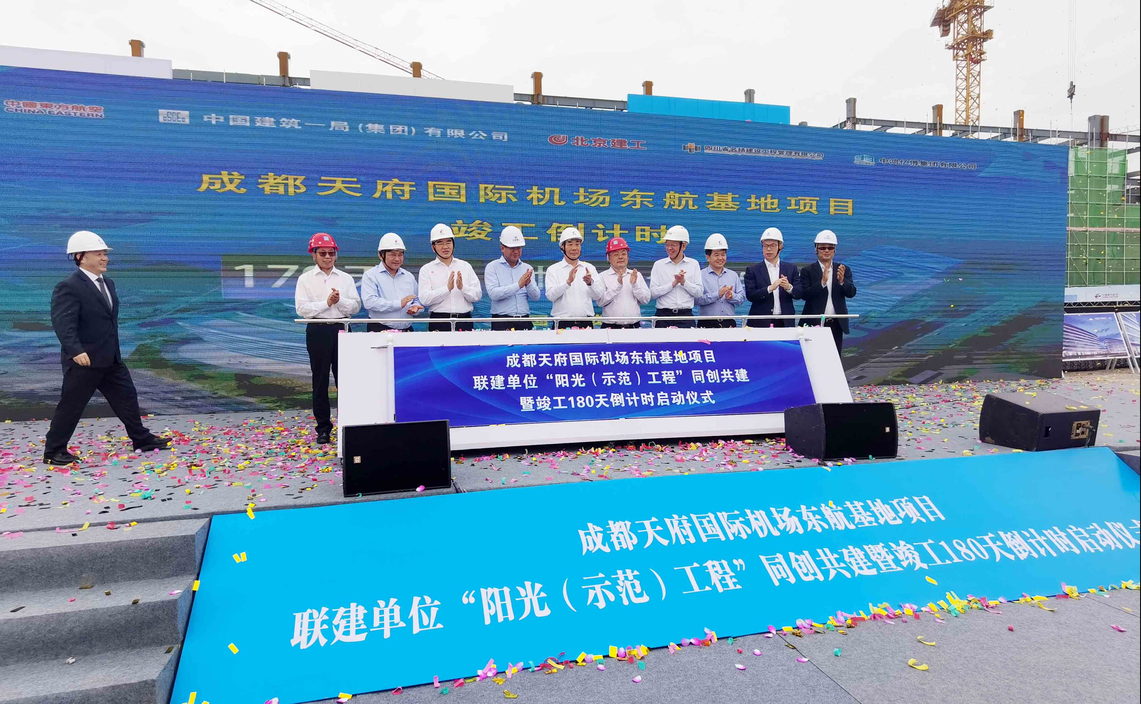2020年6月3日上午,成都天府國(guó)際機(jī)場(chǎng)東航基地“陽(yáng)光工程暨竣工180天倒計(jì)時(shí)啟動(dòng)儀式”在天府國(guó)際機(jī)場(chǎng)隆重舉行。中國(guó)東方航空集團(tuán)有限公司總經(jīng)理、黨組副書(shū)記李養(yǎng)民,副黨組成員、副總經(jīng)理馮德華,黨組成員、副總經(jīng)理席晟,中國(guó)東方航空股份有限公司運(yùn)行總監(jiān)胡振明等領(lǐng)導(dǎo)參與儀式。集團(tuán)董事長(zhǎng)張敏,總經(jīng)理何涌泉受邀參加儀式。同時(shí)參與啟動(dòng)儀式的還有參加?xùn)|航基地建設(shè)的聯(lián)建單位中國(guó)建筑一局(集團(tuán))有限公司董事長(zhǎng)、黨委書(shū)記羅世威。北京建工集團(tuán)有限責(zé)任公司總經(jīng)理郭明星等。