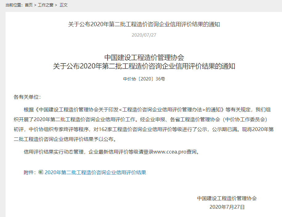 近日,根據(jù)《中國建設工程造價管理協(xié)會關于印發(fā)<工程造價咨詢企業(yè)信用評價管理辦法>的通知》等有關規(guī)定,中國建設工程造價管理協(xié)會組織開展了2020年第二批工程造價咨詢企業(yè)信用評價工作,經(jīng)企業(yè)申報、各省級工程造價協(xié)會初評(中價協(xié)工作委員會),中價協(xié)組織專家終評等程序后公布了2020年第二批工程造價咨詢企業(yè)信用評價的結(jié)果。