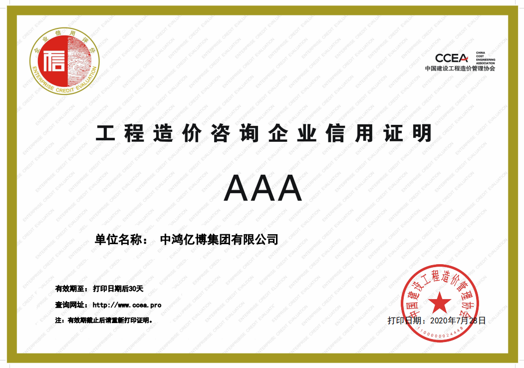 其中,中鴻億博集團有限公司憑借良好的生產(chǎn)經(jīng)營業(yè)績、健全的組織管理體系,良好的財務狀況及優(yōu)秀的履約能力以及在誠信建設方面的管理手段,順利通過中國建設工程造價管理協(xié)會社會信用評價AAA級信用評審,標志著中鴻億博集團有限公司在企業(yè)誠信建設上又邁向了新臺階。