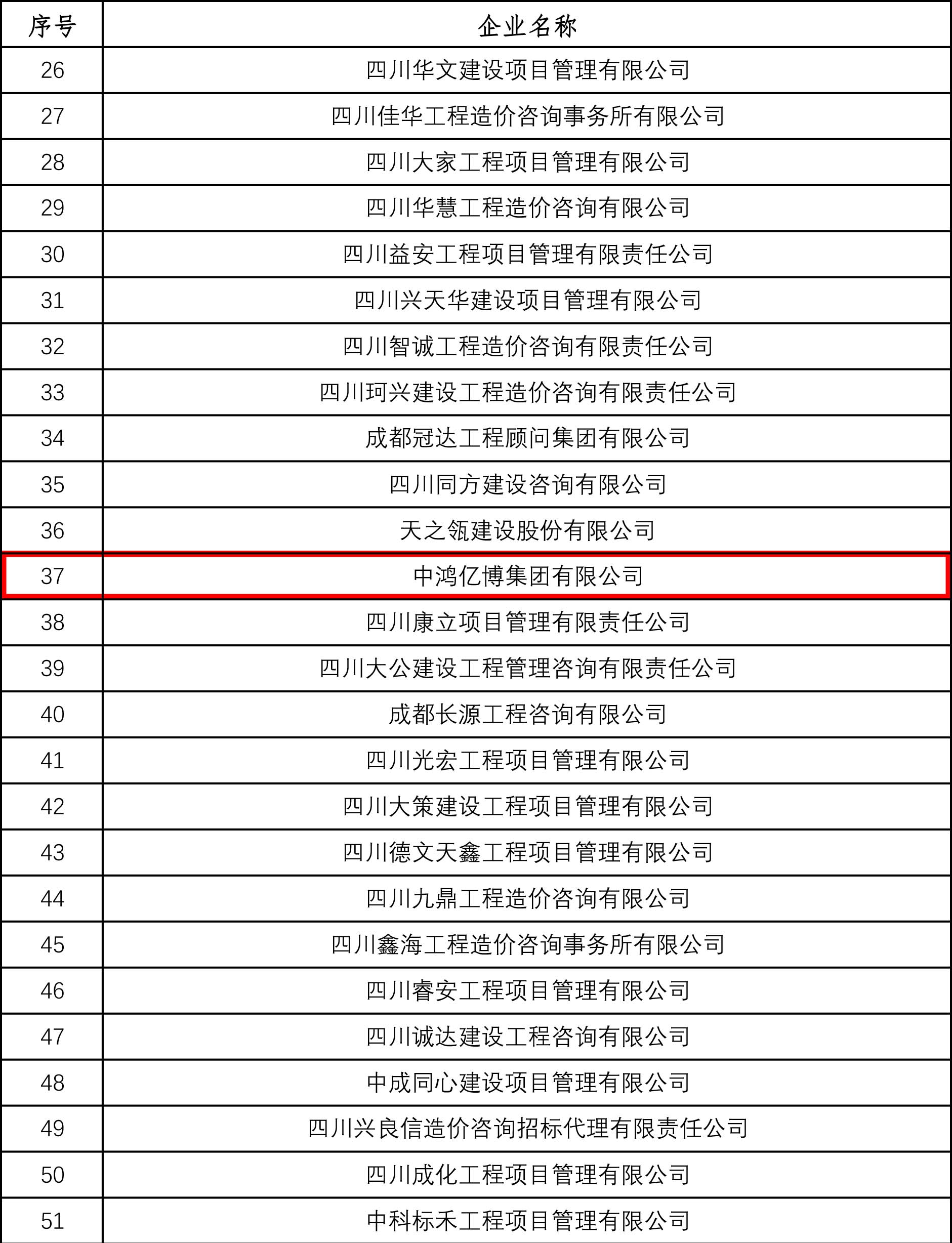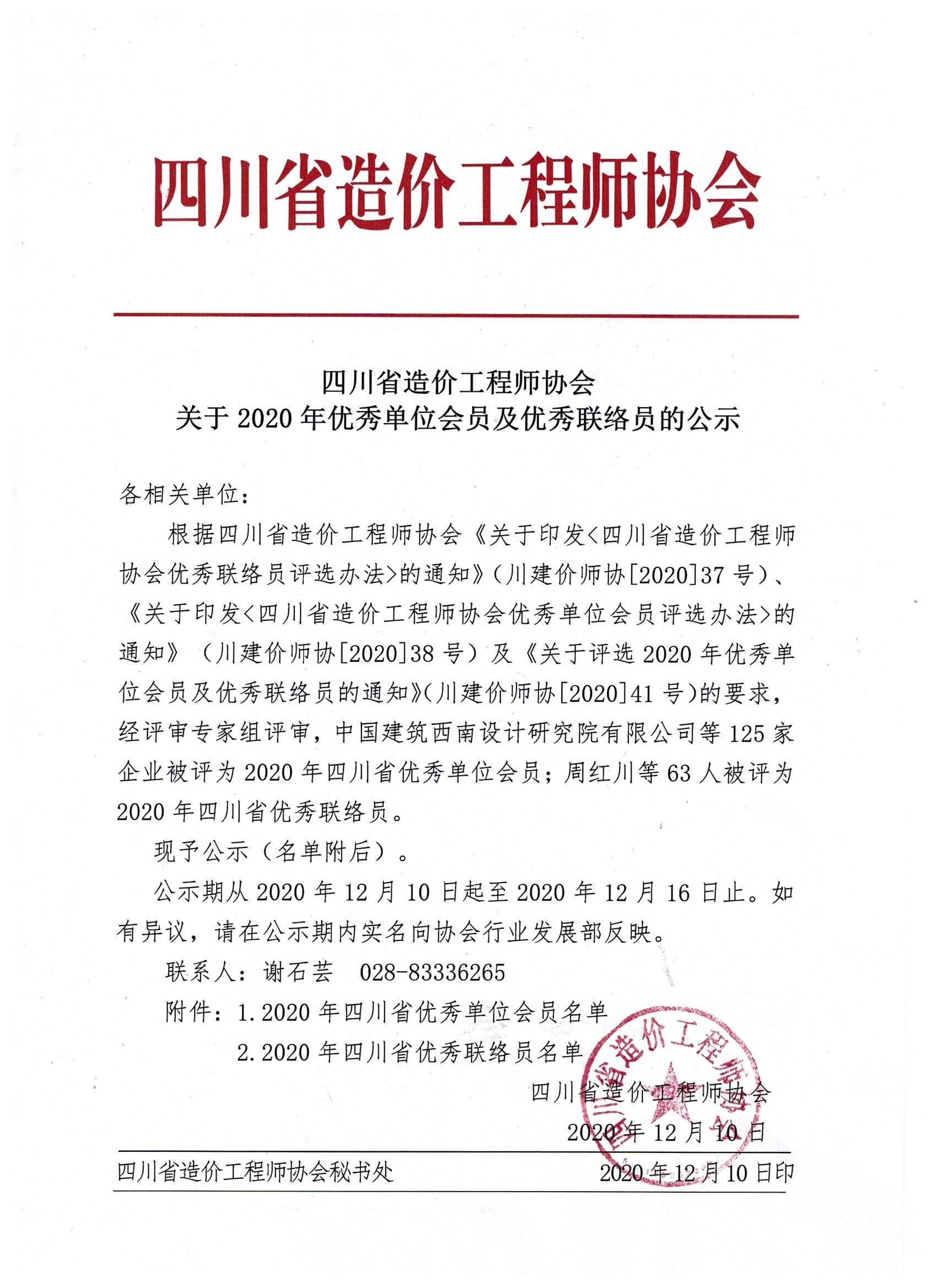 12月10日,四川省造價(jià)工程師協(xié)會發(fā)布了《關(guān)于印發(fā)<四川省造價(jià)工程師協(xié)會優(yōu)秀聯(lián)絡(luò)員評選辦法>的通知》(川建價(jià)師協(xié)[2020]37號)《關(guān)于印發(fā)<四川省造價(jià)工程師協(xié)會優(yōu)秀單位會員評選辦法>的通知》(川建價(jià)師協(xié)[2020]38號)及《關(guān)于評選2020年優(yōu)秀單位會員及優(yōu)秀聯(lián)絡(luò)員的通知》(川建價(jià)師協(xié)[2020]41號),經(jīng)評審專家組評審,中鴻億博集團(tuán)有限公司等125家企業(yè)被評為2020年四川省優(yōu)秀單位會員。