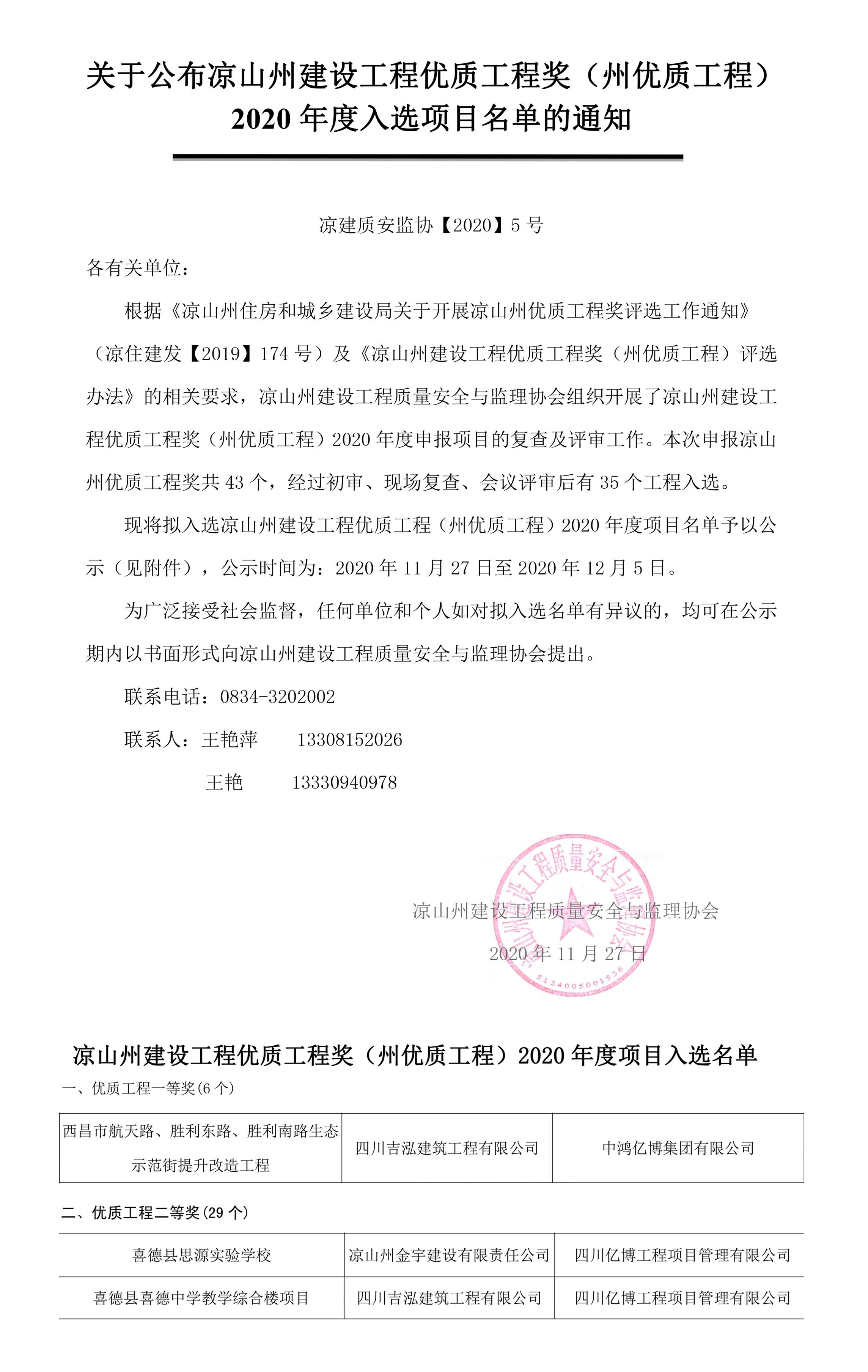 在經(jīng)歷了春的草長鶯飛,夏的綠樹成蔭,秋的瓜果飄香,集團(tuán)在銀裝素裹中迎來滿滿收獲。12月,2020年度涼山州建設(shè)工程優(yōu)質(zhì)工程獎(jiǎng)入選項(xiàng)目名單公布,通過嚴(yán)格評定,集團(tuán)承監(jiān)的3項(xiàng)工程 榮譽(yù)上榜!斬獲一等獎(jiǎng)一項(xiàng)、二等獎(jiǎng)兩項(xiàng)!