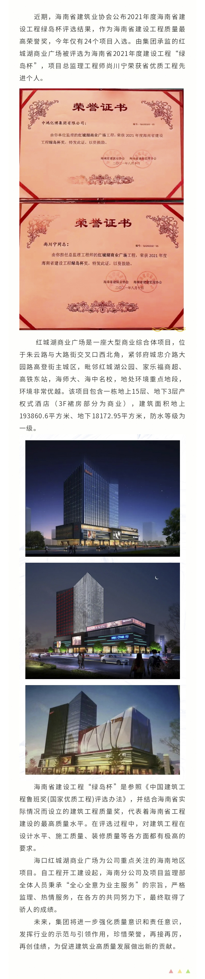 【再添一省獎 】集團(tuán)監(jiān)理紅城湖商業(yè)廣場項(xiàng)目獲評“綠島杯”