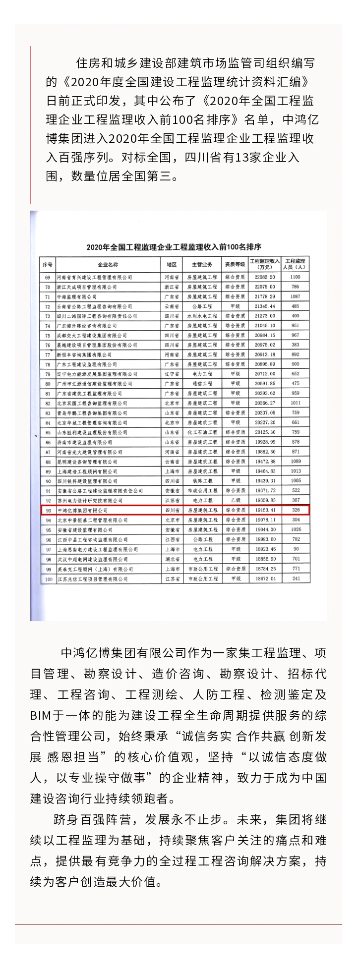 集團(tuán)入圍2020年全國工程監(jiān)理收入百強(qiáng)企業(yè)