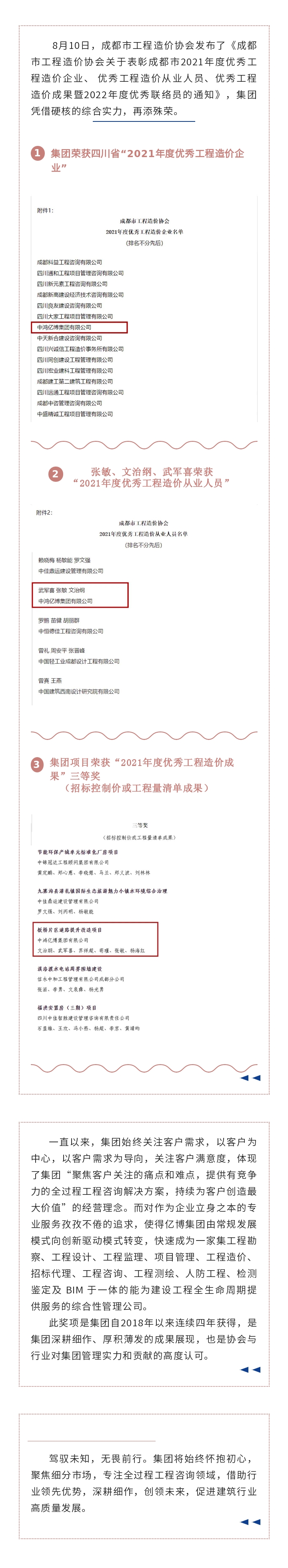 集團連續(xù)四年榮獲成都市工程造價行業(yè)多項大獎