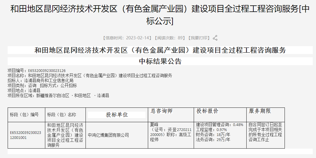 2023年2月14日,集團(tuán)中標(biāo)“和田地區(qū)昆岡經(jīng)濟(jì)技術(shù)開發(fā)區(qū)(有色金屬產(chǎn)業(yè)園)建設(shè)項(xiàng)目”全過程工程咨詢,為該項(xiàng)目提供建設(shè)項(xiàng)目管理、工程監(jiān)理、財(cái)務(wù)咨詢等全過程工程咨詢服務(wù)。