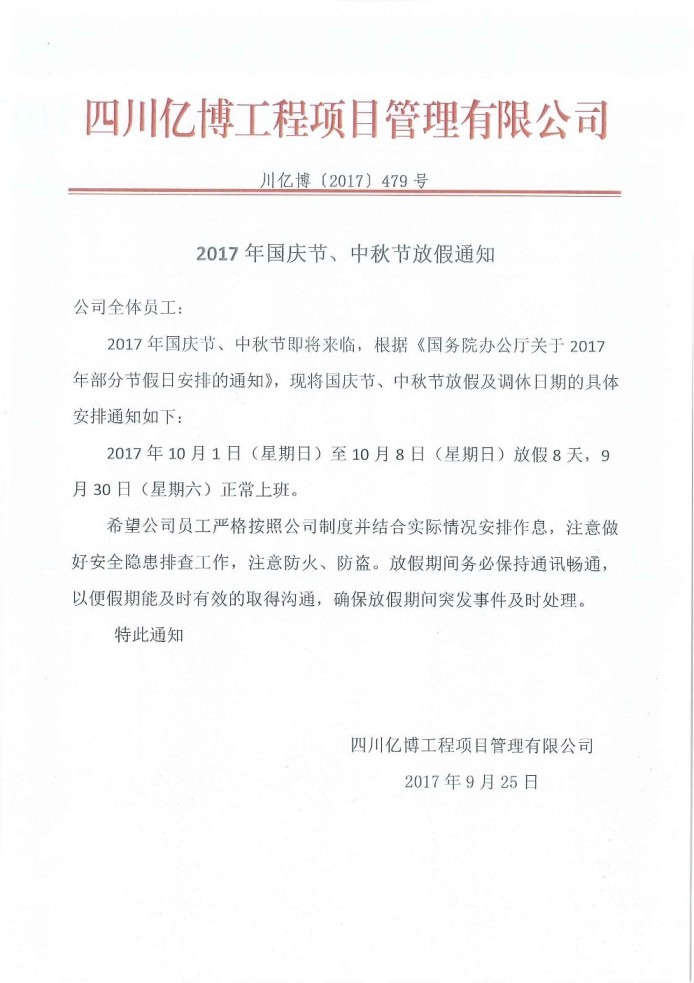 2017年國慶節(jié)、中秋節(jié)放假通知