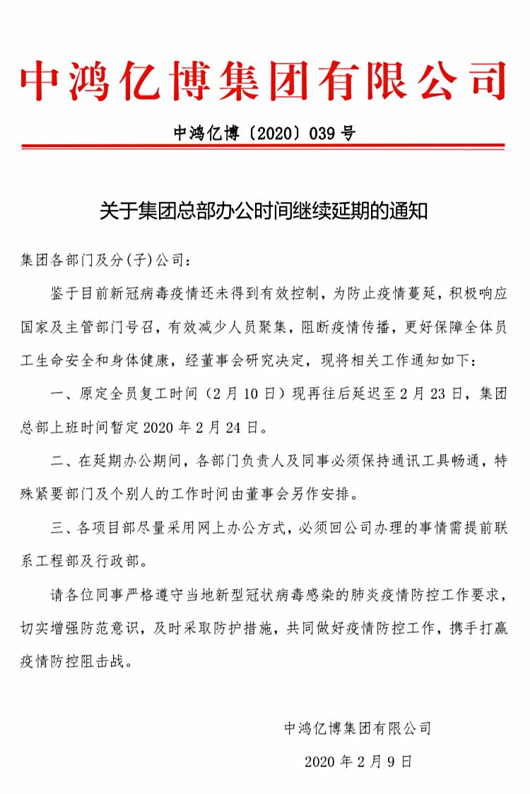 中鴻億博集團(tuán)關(guān)于集團(tuán)總部辦公時(shí)間繼續(xù)延期的通知